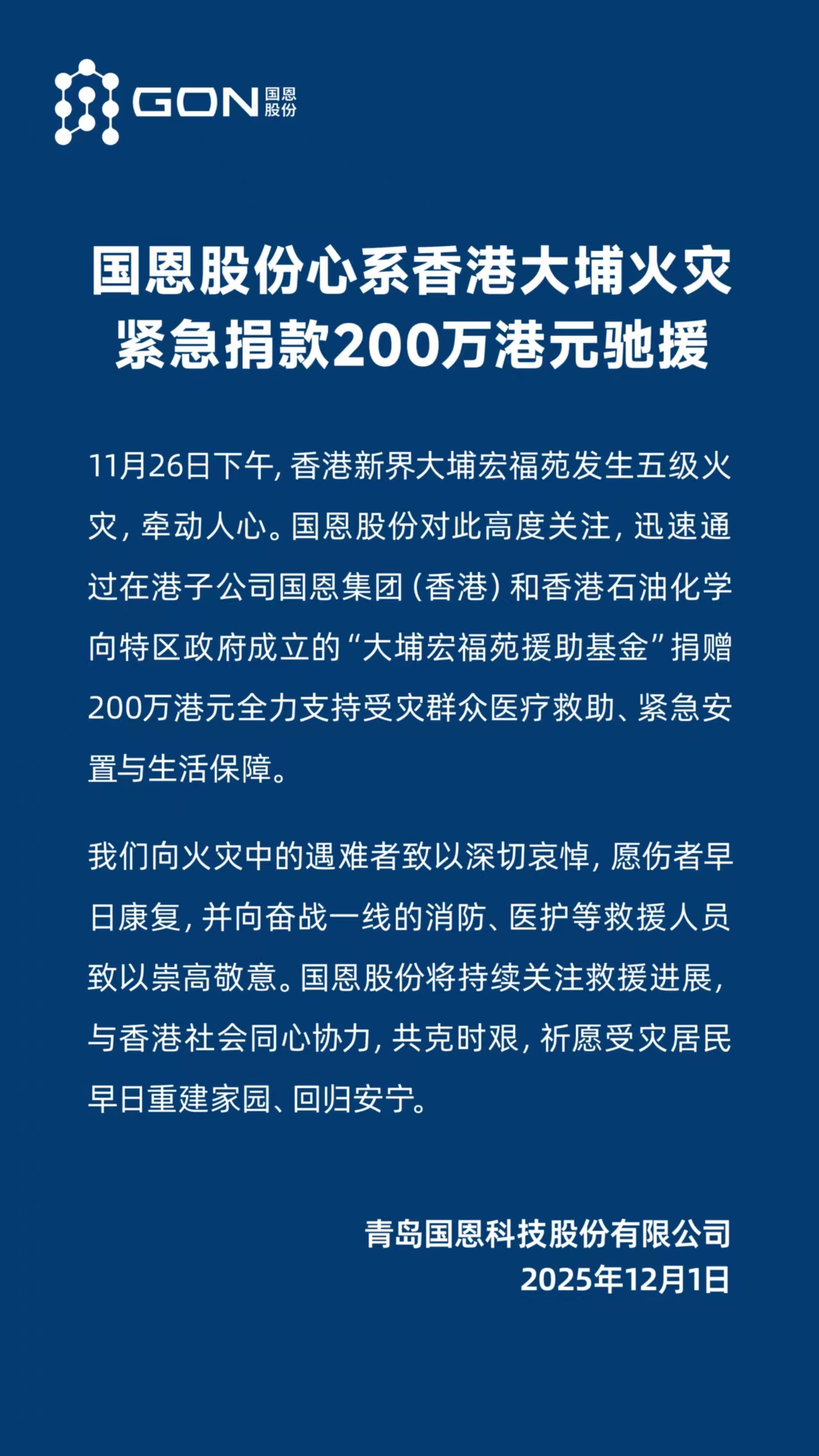 国恩股份心系香港大埔火灾,紧急捐款200万港元驰援