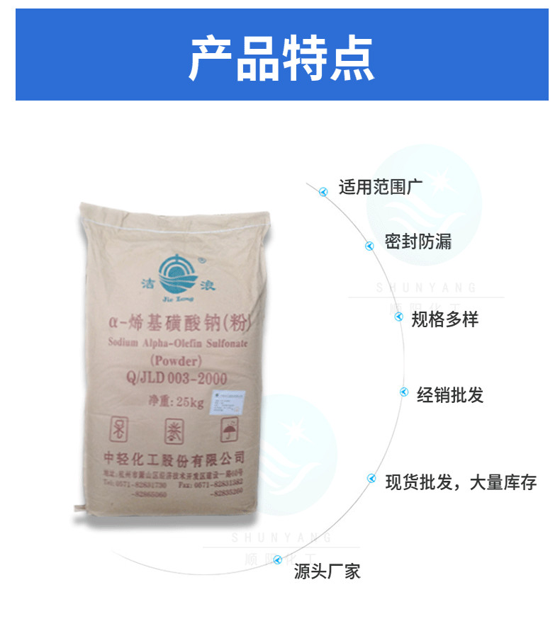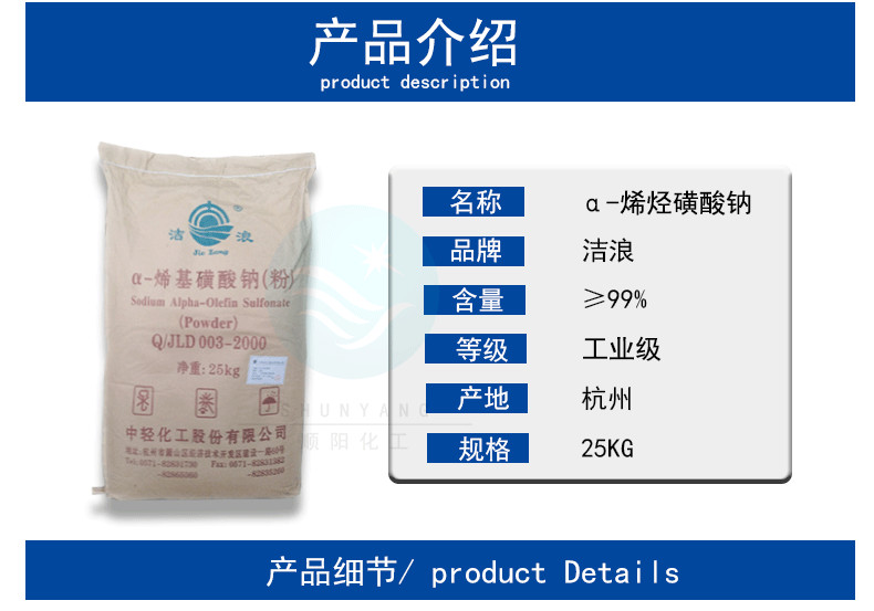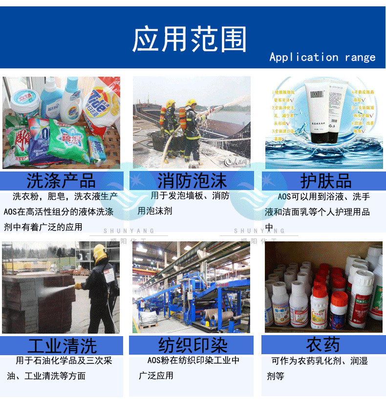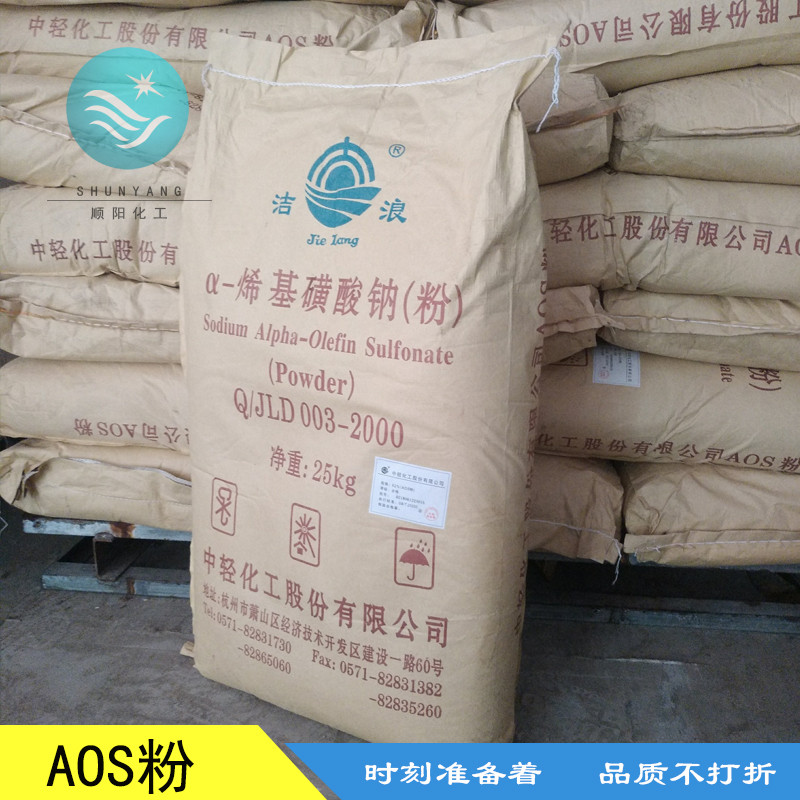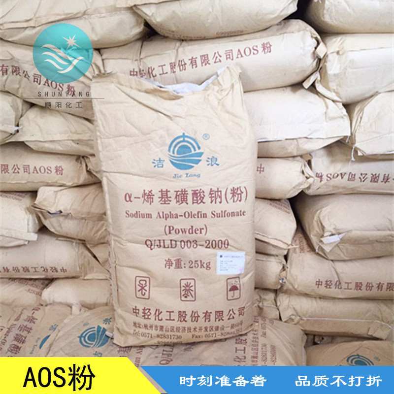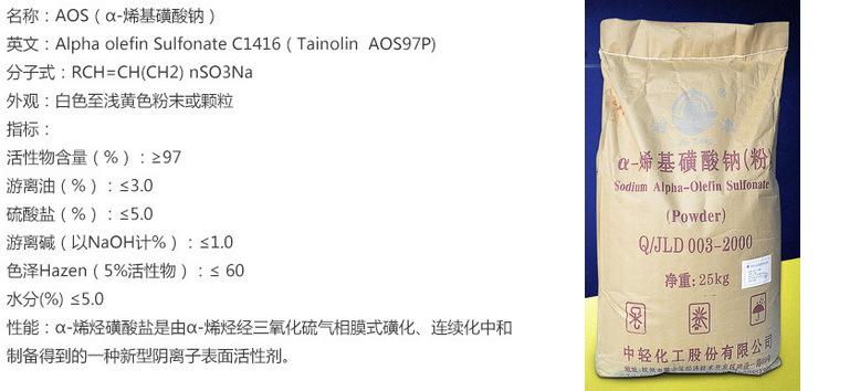 α-烯基磺酸钠 AOS( α-烯烃磺酸钠 )具有很好的综合性能。工艺成熟,质量可靠,有很好的去污力,特别在硬水中也显示出去污力基本不降低的特点。AOS生物降解性好,在日本、韩国、印度、美国等地已被大量生产和使用。在我国,正在开发它在油田助剂、淀粉加工助剂、丙烯酸酯乳液聚合、棉的丝光处理、羊毛洗涤、纺织和造纸的润湿剂等领域中的应用。可望在不久的将来AOS会成为新一代主要的合成洗涤剂原料,而广泛地用于家用和工业用洗涤用品中。