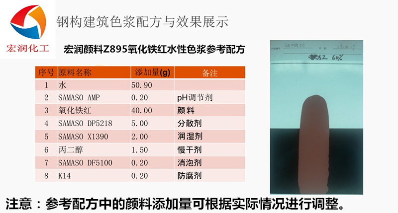 Z895氧化铁红为干法工艺生产的氧化铁红,环保颜料。颜色为紫相铁红色,比S190氧化铁红颜色还要偏紫相,具有优异的耐酸性、耐碱性、耐热性、耐光性、耐热性和化学稳定性。