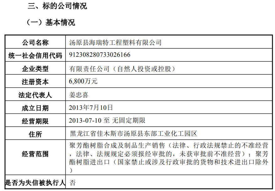根据公告,海瑞特成立于2013年,注资6800万元,法人姜忠喜,主要从事聚醚醚酮(PEEK)特种树脂和聚芳醚酮(PAEK)低熔点特种树脂合成及其改性树脂研发、生产、销售为主的高新技术企业,具有200余吨/年的高品质PEEK树脂及PAEK低熔点树脂工业化生产能力,产品主要可用于航空航天、汽车、电子电气、能源、医疗器械等领域。
