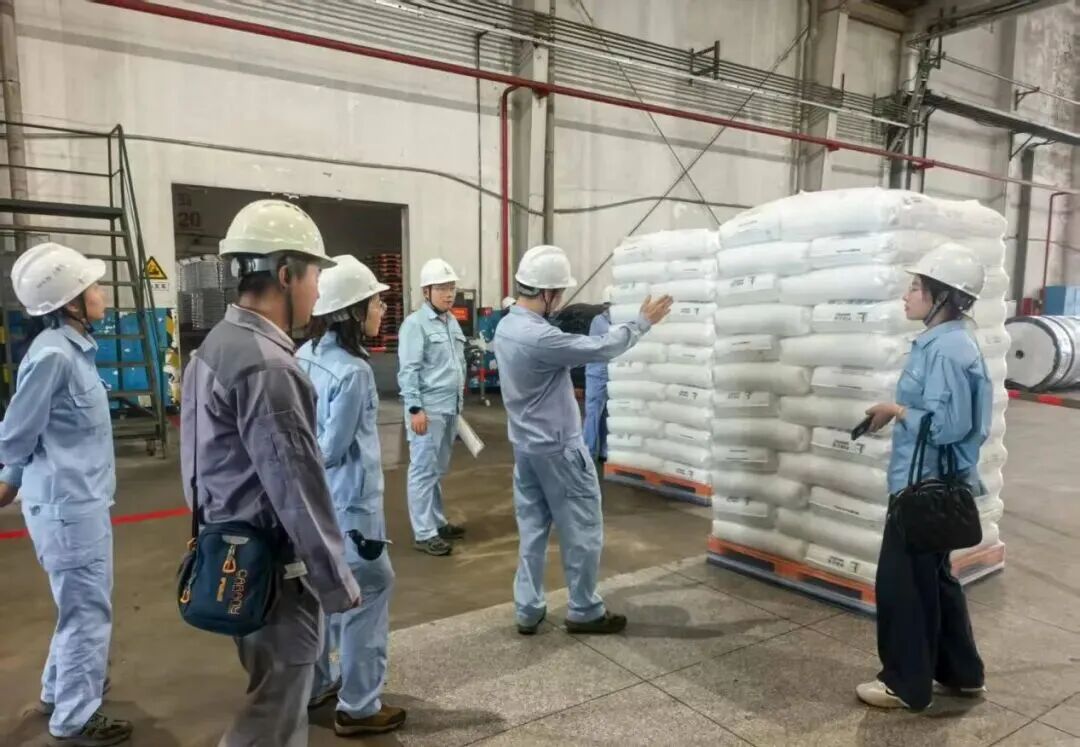 2025年9月1日,华南公司郭茜(右一)、茂名石化分公司钱程(右二)与茂名石化研究院、冷套膜厂家代表在茂名石化车间调研冷套膜试用情况